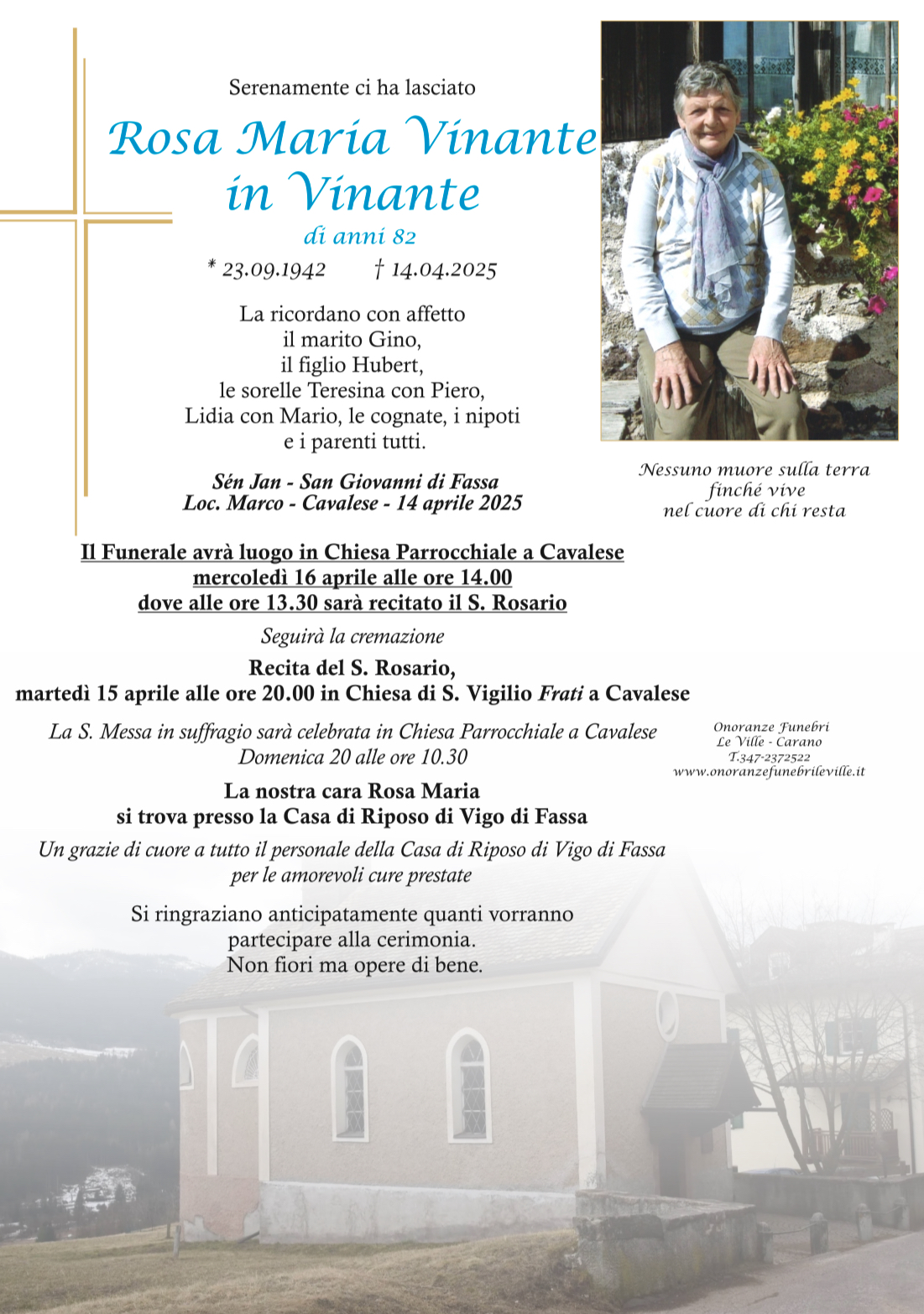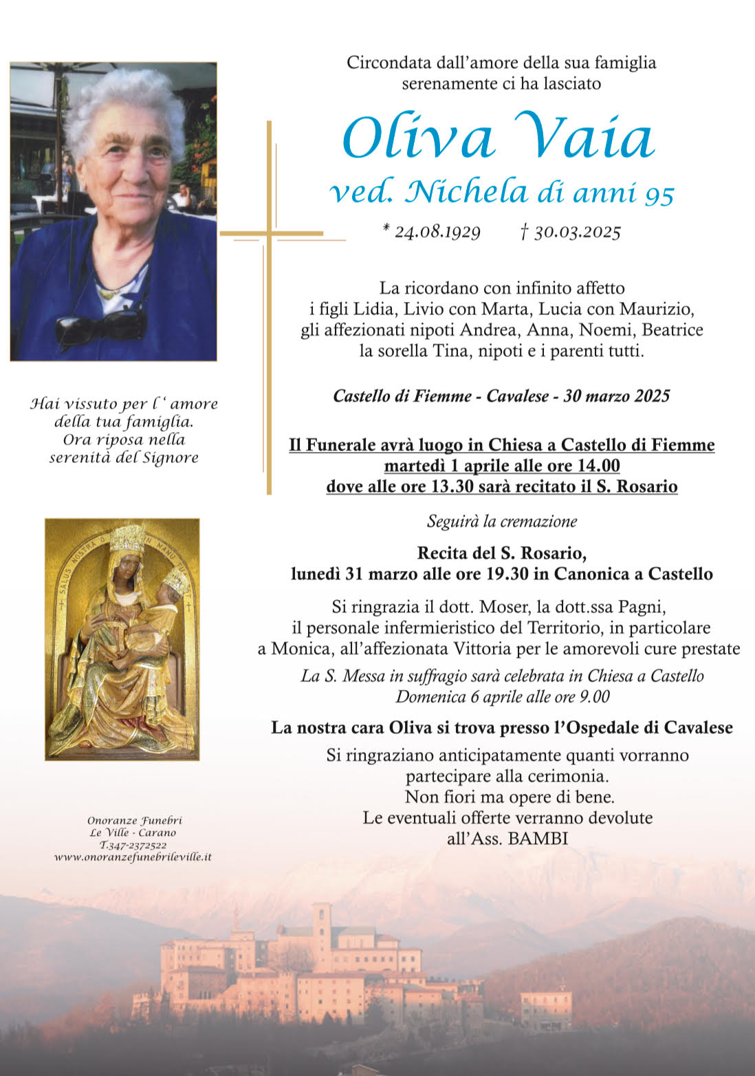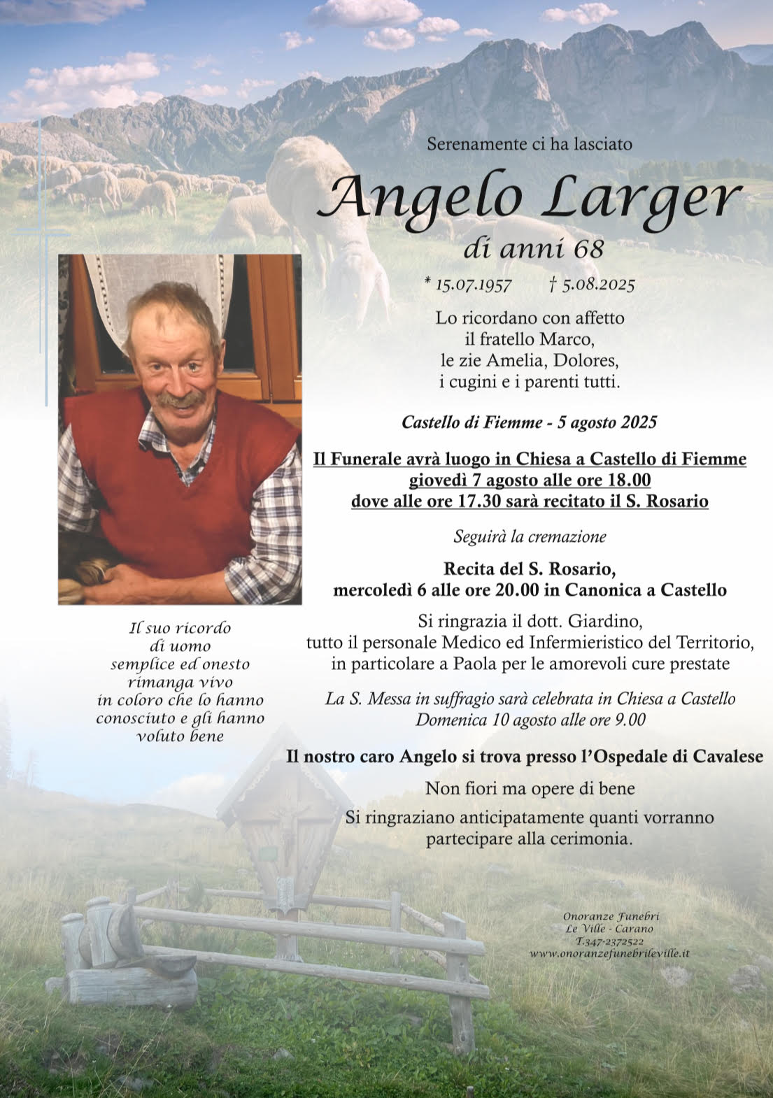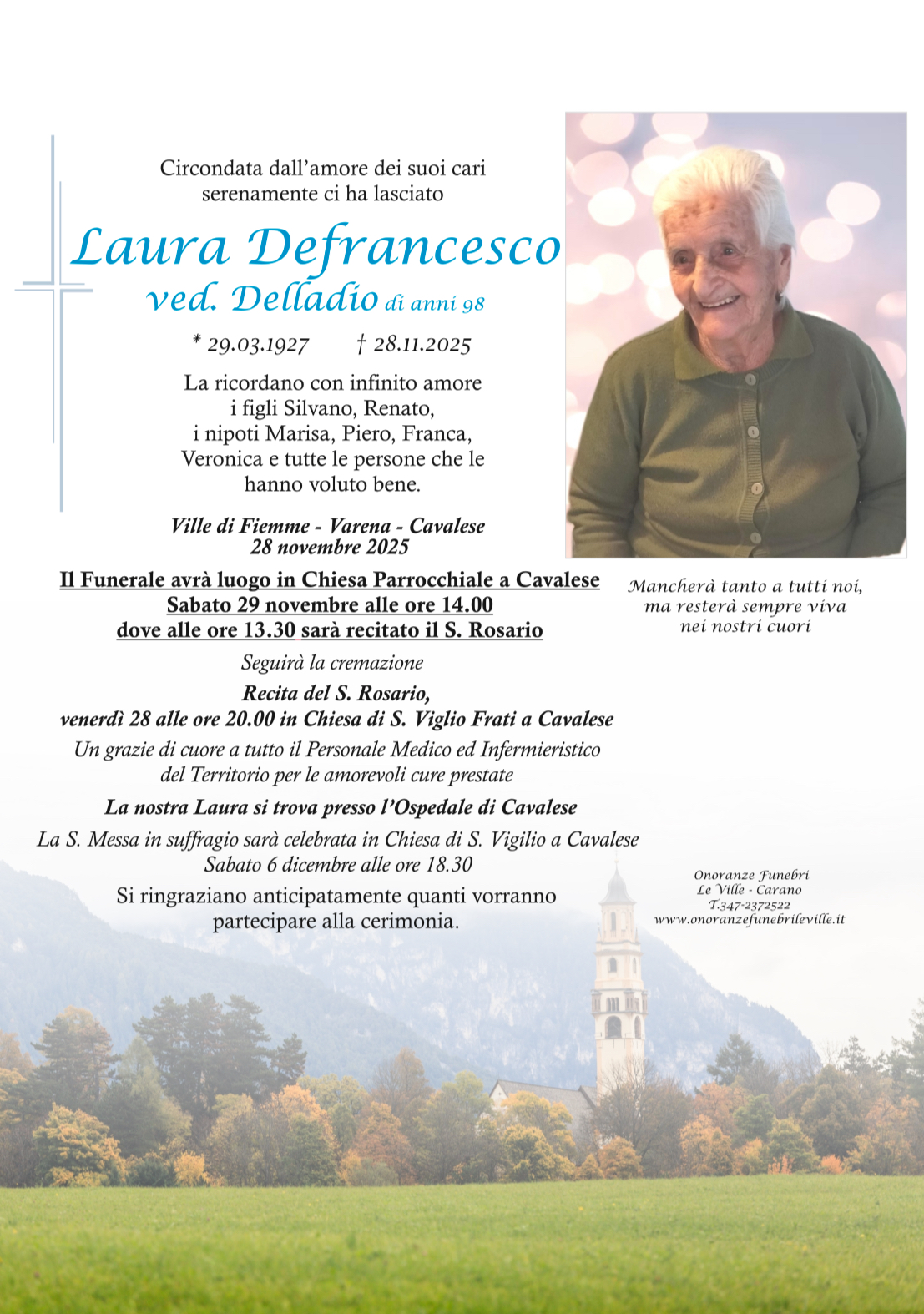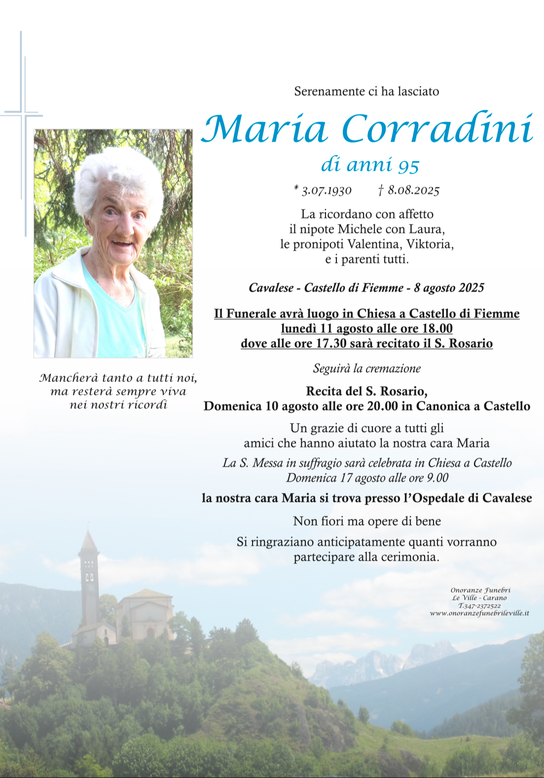 Onoranze Funebri Le Ville, con sede a Ville di Fiemme, frazione di Carano, è un’impresa di onoranze funebri presente in Valle di Fiemme da oltre 10 anni.